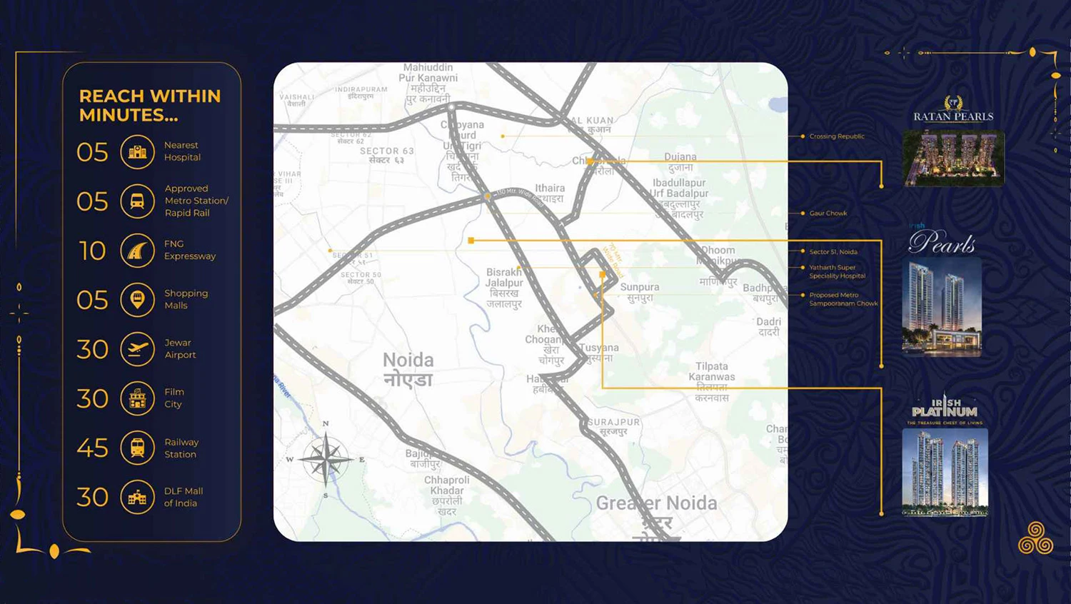 The group boasts three prestigious projects in Greater Noida West. Ratan Pearls, located in Sector 16, is a successfully completed project that reflects quality craftsmanship. Irish Pearls, situated in Sector 1, is nearing possession and promises a sophisticated lifestyle. Irish Platinum, the ongoing project in Sector 10, offers ultra-luxury apartments with modern design and top-class amenities.